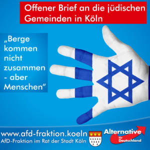 Antisemitismus hat in der AfD keinen Platz. Die allgemeine Auffassung und die jüngst getätigten Aussagen der Baden – Württembergischen Landtagsabgeordneten Räpple und Gedeon zur Gründung der Juden in der AfD, werden von der überwältigenden Mehrheit in der AfD und insbesondere von der Kölner AfD – Ratsfraktion nicht geteilt. Wir erachten diese Gründung als natürlichen Schritt der Partizipation jüdischer Mitbürger an der politischen Willensbildung innerhalb unserer Partei.