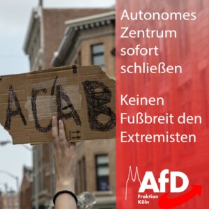 „Frau Reker sollte dieses Engagement lieber bei Ford einbringen. Wir wollen, dass die Gespräche mit dem AZ sofort abgebrochen werden und das Autonome Zentrum gehört sofort geschlossen“; sagte Christer Cremer, stellv. Fraktionsvorsitzender der neuen AfD-Ratsfraktion und derzeit Sachkundiger Einwohner im AVR.