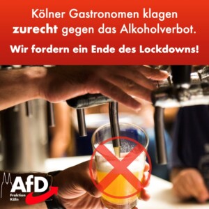 26.02.2021 KÖLN: Die IG Gastro Köln will gegen die willkürlichen Maßnahmen der Stadt klagen. Hintergrund sind die nicht verständlichen „Hotspots“ an denen ein Alkoholverkaufsverbot verhangen werden soll. Die AfD befürwortet den notwendigen Schritt der Klage.