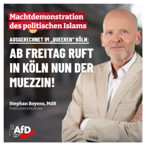 Ab morgen bewahrheitet sich das, wovor wir als AfD-Fraktion und weitere Kritiker bereits seit vielen Jahren eindringlich warnen: Der Muezzin ertönt erstmals und von da an auch regelmäßig aus den Lautsprechern der DITIB-Zentralmoschee in Köln-Ehrenfeld.