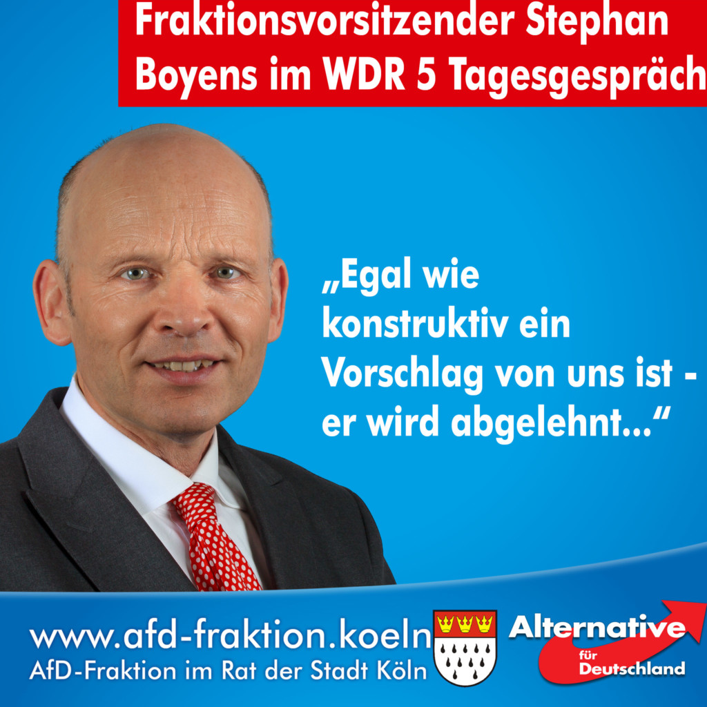 Fraktionsvorsitzender Stephan Boyens (AfD) äußert sich zum Thema „Angsträume in NRW – Welche Gegenden meiden Sie?“ ab Minute 20:50: http://www1.wdr.de/mediathek/audio/wdr5/wdr5-tagesgespraech/audio-angstraeume-in-nrw-welche-gegenden-meiden-sie-100.html