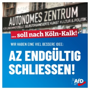 „Ich betone unsere Forderung nach der schnellstmöglichen Schließung des AZ und dem sofortigen, kompromisslosen Abbruch der Verhandlungen über eventuelle Alternativstandorte. Dort sind verschiedene linksextreme Gruppierungen untergebracht. Es ist der Anlaufpunkt für den Linksextremismus im Regierungsbezirk Köln. Das sage nicht ich, sondern die Landesregierung. Vom AZ gingen schon in der Vergangenheit immer wieder Einschüchterungen aus. Die Oberbürgermeisterin muss die Zusammenarbeit jetzt stoppen. Das intransparente Vorgehen der Stadtverwaltung ähnelt dem beim Muezzinruf“, stellt Christer Cremer, stellv. Fraktionsvorsitzender der AfD Ratsfraktion, fest.