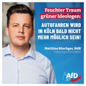 „Die übrigen Fraktionen im Stadtrat wollen diese Entscheidung einfach hinnehmen. Es wird von Fahrverboten geträumt, es sollen mehr E Autos auf die Straßen, oder gar ein kommunales Tempolimit eingeführt werden. Unfassbar, denn noch mehr kann man gar nicht forcieren, die Stadt autofrei zu bekommen. Wer soll sich bitte bei den gegenwärtigen Preisen ein E Auto leisten können? Oder wer soll bei einem ÖPNV, der auf der Felge fährt, und der im Schichtdienst arbeitet, pünktlich zur Arbeit kommen, ganz zu schweigen von den Handwerkern und Dienstleistern? Sollen diese Menschen mit dem Bus fahren? Fragen, auf die die Politik, vor allem aber das Bündnis, keine Antwort hat“, sagt der Fraktionsgeschäftsführer der Kölner AfD Ratsfraktion, Matthias Büschges.