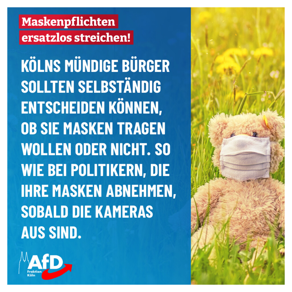 Maskenpflicht in städtischen Gebäuden ersatzlos abschaffen Mündige Bürger müssen selbst entscheiden dürfen KÖLN, den 17.10.2022. Der Verband der deutschen Krankenhäuser fordert die Wiedereinführung der Maskenpflicht in Innenräumen. Sie stünden mit […]