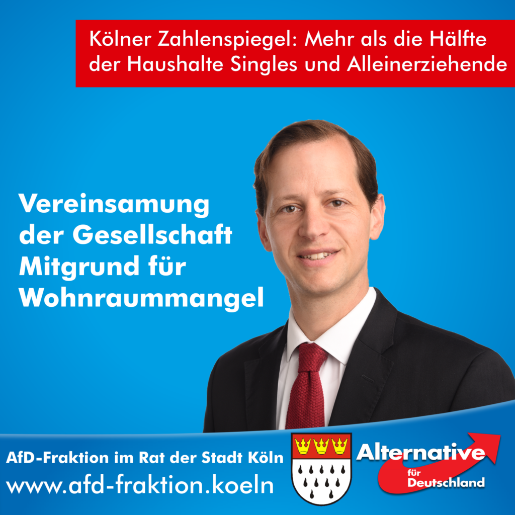 KÖLN, 10.11.2016. Die Alternative für Deutschland (AfD) im Rat der Stadt Köln weist mit Sorge auf die Vereinzelung vieler Menschen in Köln hin. „Wenn von insgesamt 557.090 Haushalten in Köln […]