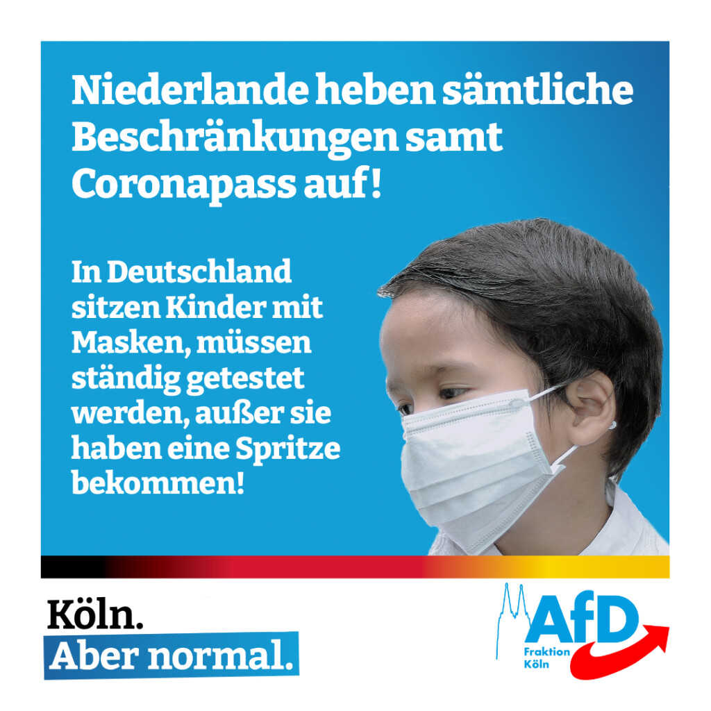 Der Rat der Stadt Köln appelliert, dass das Land Nordrhein-Westfalen sämtliche Corona Beschrän- kungen zumindest für Kinder unter 10 Jahren streicht. Das Land Nordrhein-Westfalen wird darüber hinaus aufgefordert, ein festes Datum, einen Freiheitstag, für den Entfall sämtlicher Corona- Restriktionen innerhalb der nächsten vier Wochen festzulegen.